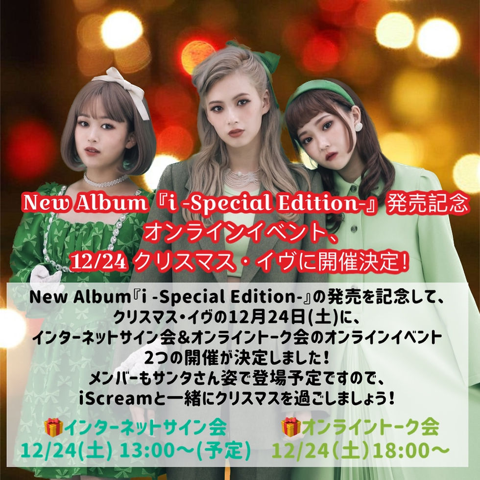 New Album『i -Special Edition-』の発売を記念して、クリスマス・イヴの12月24日(土)に、インターネットサイン会&オンライントーク会のオンラインイベント2つの開催が決定しました!メンバーもサンタさん姿で登場予定ですので、iScreamと一緒にクリスマスを過ごしましょう!